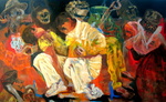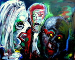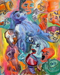 2016Dit werk is in opdracht gemaakt als ode aan de oprichters van de IKO Kunstacademie Hoogstraten ter gelegenheid van het 60 jarig bestaan van de Academie. Uitgangspunt was een klein “moeder met kind” werk van Jos Adams, één van de IKO oprichters. Dit bracht me bij de beelden van de Pieta. Maria met de dode Jezus in haar armen. Vertaald naar een eigentijdsbeeld: man met zoon. De wereld kijkt toe, of liever gezegd....de wereld ziet het leed niet of... wil het niet zien. Zowel het palet als de maskerade figuren zijn gebaseerd op James Ensor en Francisco Goya.