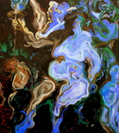 2016Dit werk verbeeld onze westerse welvaartsmaatschappij. Alles is in overvloed! Geld en succes stromen als water, vandaar dit overdadige blauwe palet in vrij stromende penseelstreken. Het donkere deel verbeeld de keerzijde van deze welvaart. Gebaseerd op Peter Paul Rubens’ Bacchus.